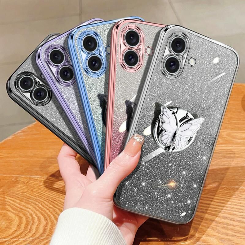 Θήκη τηλεφώνου TPU με επιμετάλλωση, διαβαθμισμένη λάμψη και πεταλούδα για iPhone 16 Plus (Ροζ)