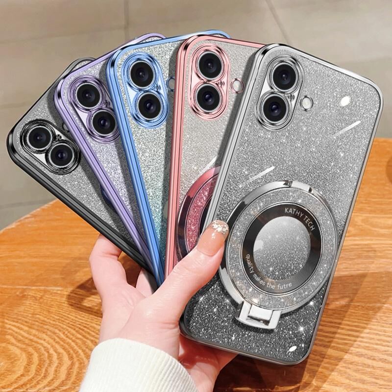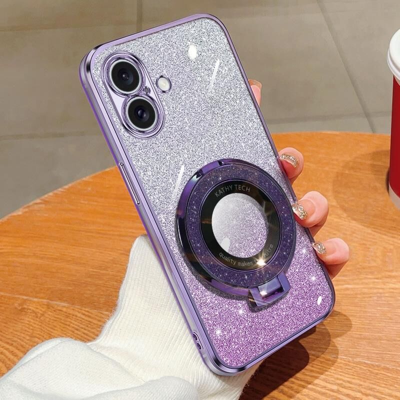 For iPhone 16 Plus Plated Gradient Glitter Round Holder TPU Phone Case(Purple)