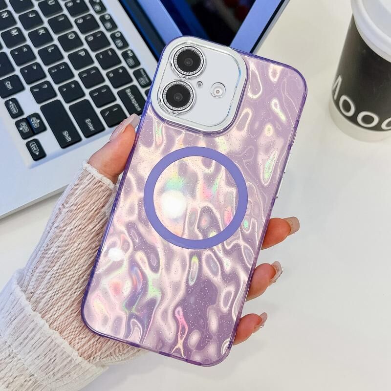 Θήκη τηλεφώνου TPU με επιμετάλλωση και υφή για iPhone 16 Plus με MagSafe και προστατευτική μεμβράνη φακού με γκλίτερ (Λευκά Κύματα Νερού)