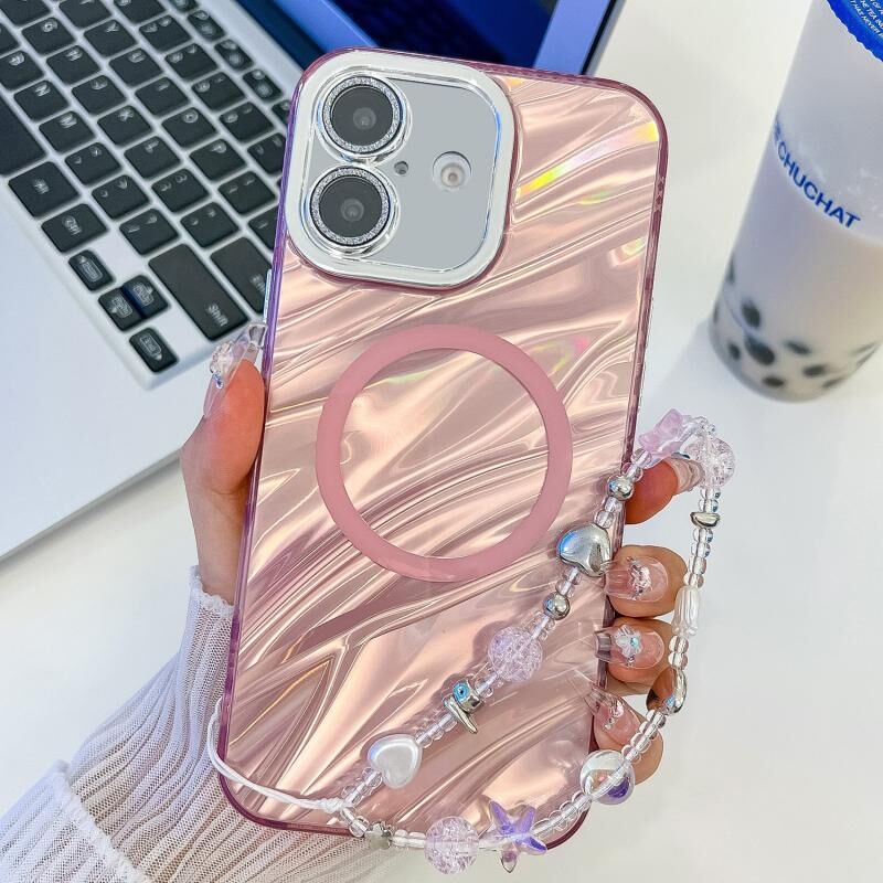 Θήκη τηλεφώνου MagSafe TPU με επιμετάλλωση και υφή βραχιολάκι για iPhone 16 Plus με προστατευτική μεμβράνη φακού με γκλίτερ (Ροζ κυματισμοί νερού)