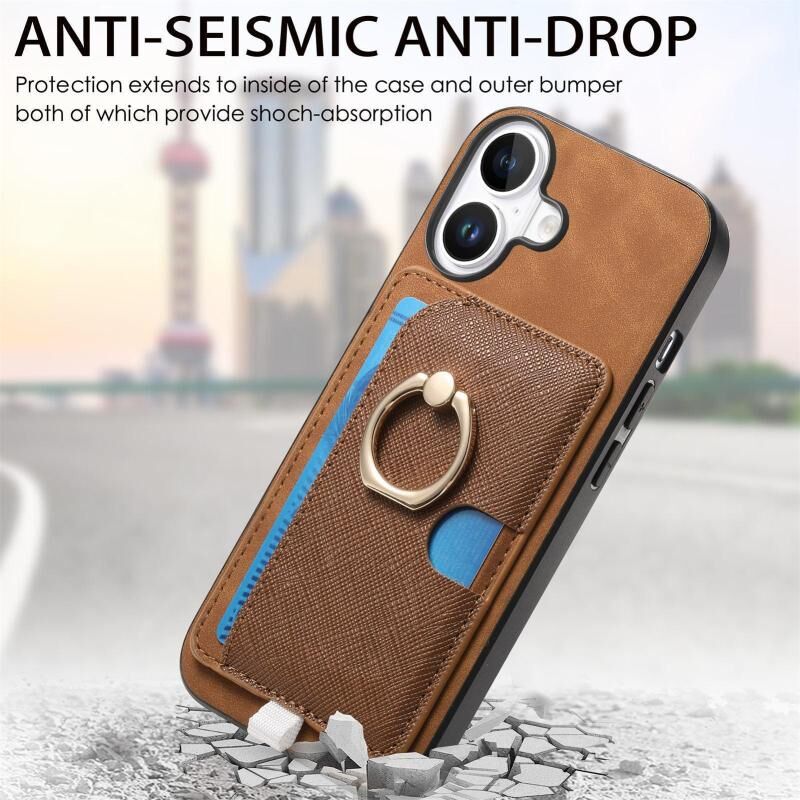 For iPhone 16 Plus Retro Cross Leather Ring Side Insert Card Bag MagSafe Phone Case(Brown)