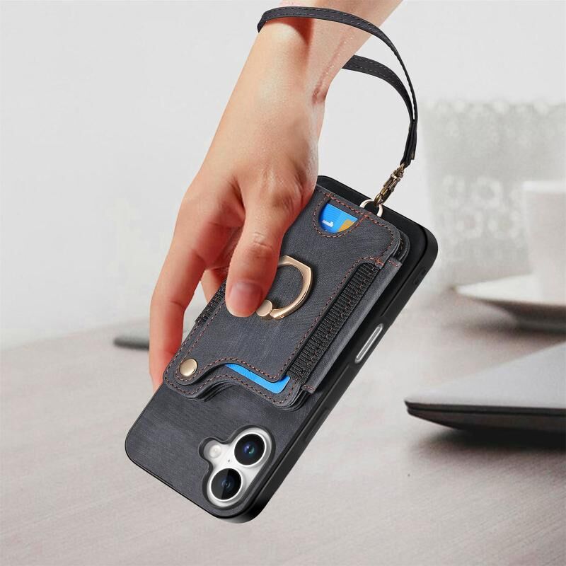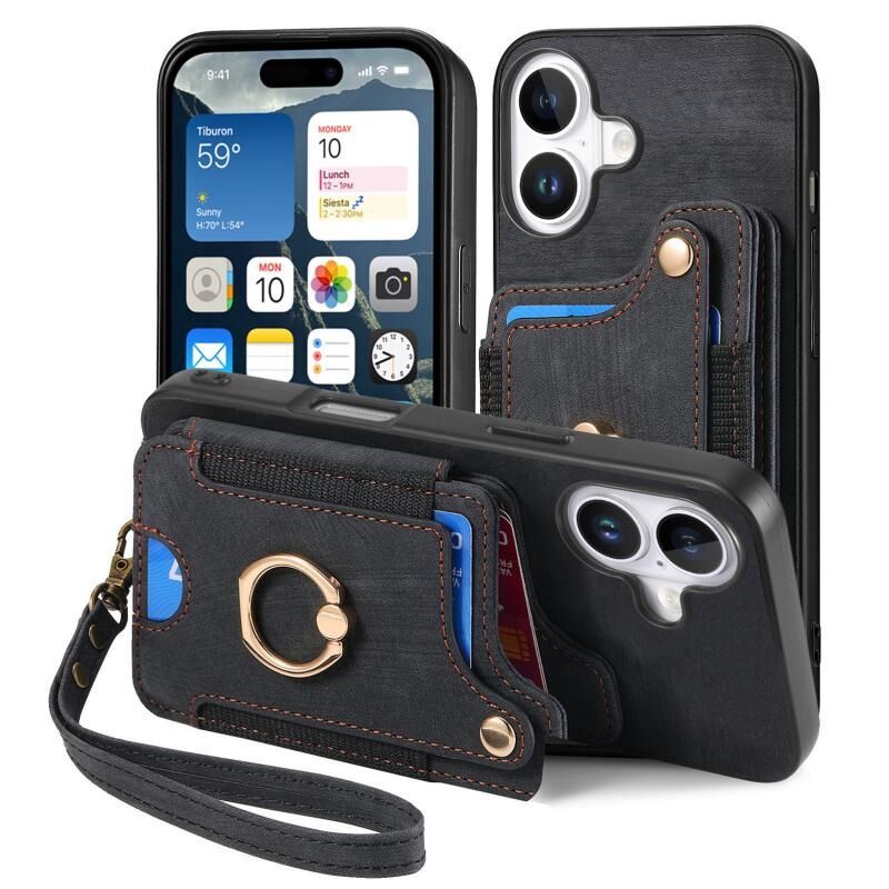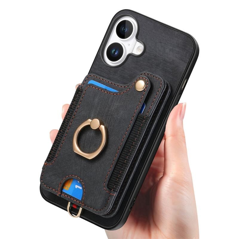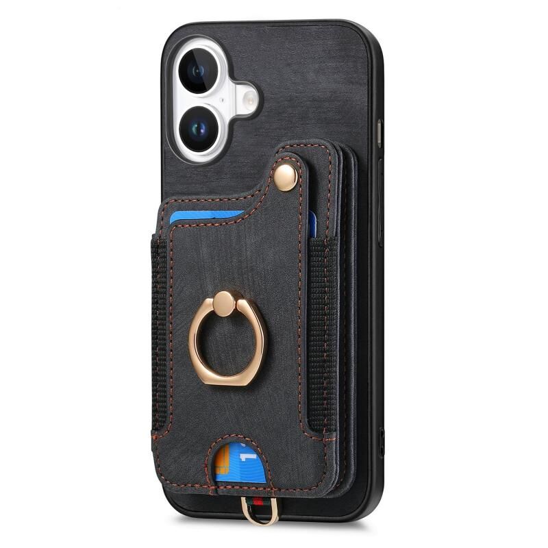 Θήκη τηλεφώνου για iPhone 16 Plus με ρετρό υφή, δακτύλιο και πολλαπλές θήκες καρτών (Μαύρο)