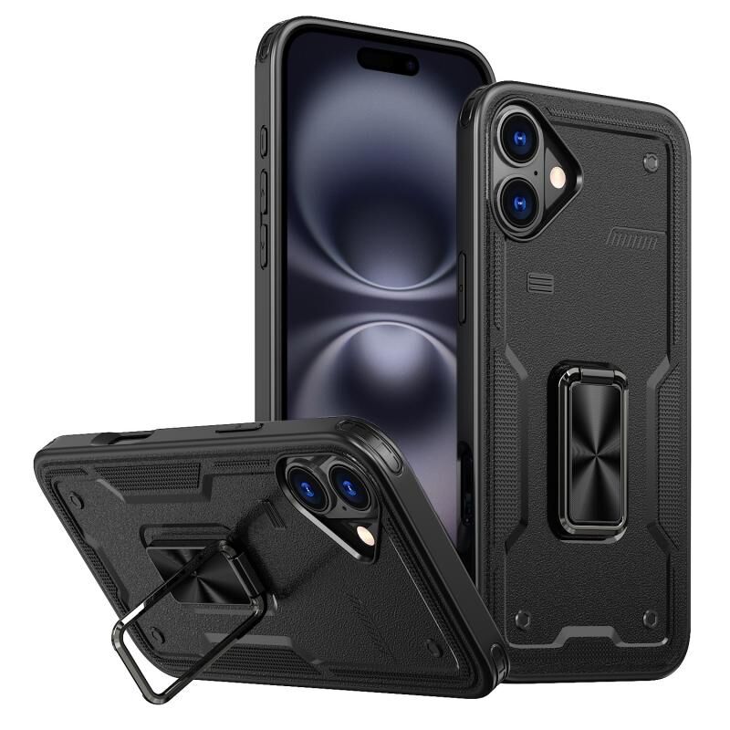 For iPhone 16 Plus Ring Holder PC Hybrid TPU Phone Case(Black)
