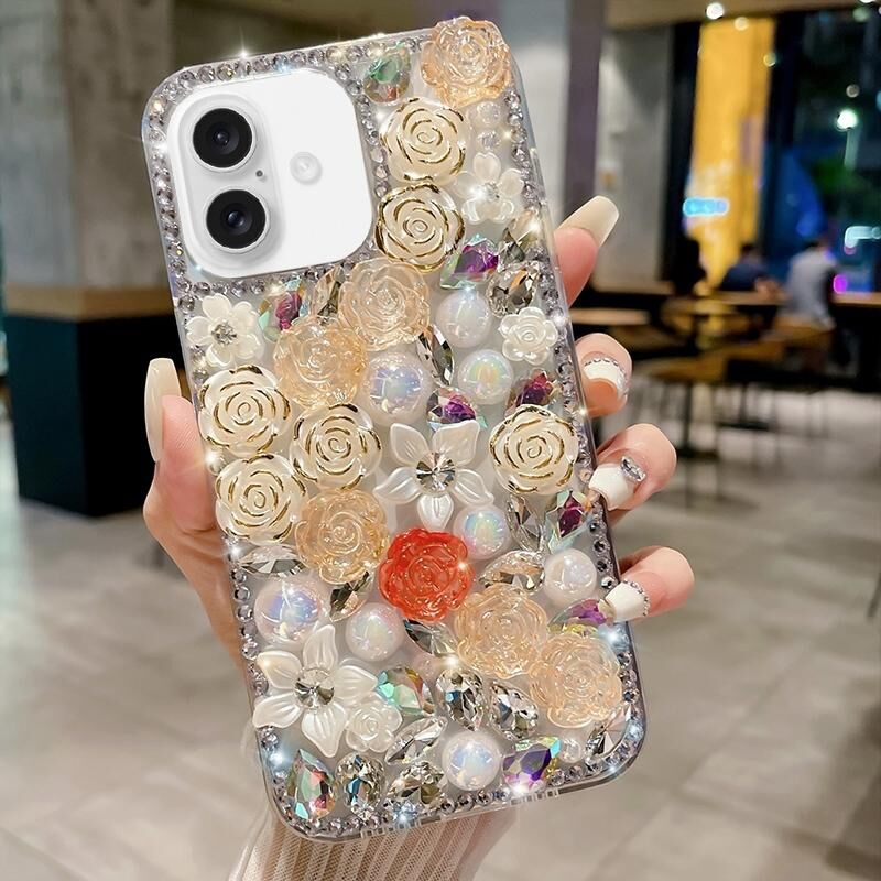 For iPhone 16 Plus Rose Hand-set Pearl Diamond PC Phone Case(Apricot)