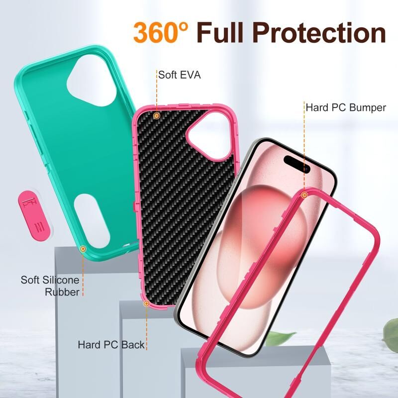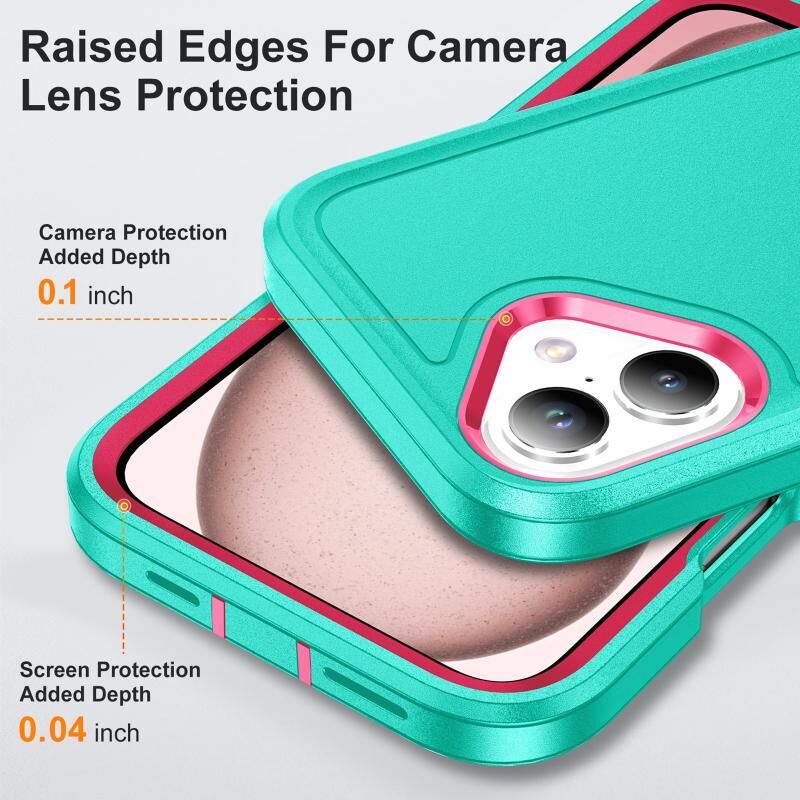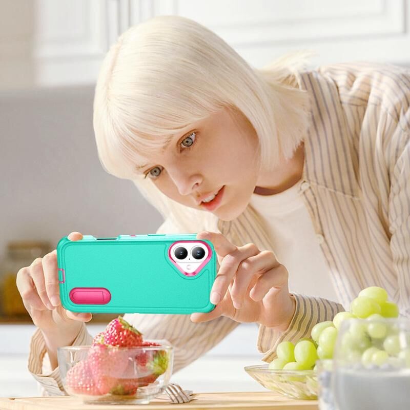 For iPhone 16 Plus Rugged PC + Silicone Phone Case with Holder(Light Green+Rose Red)
