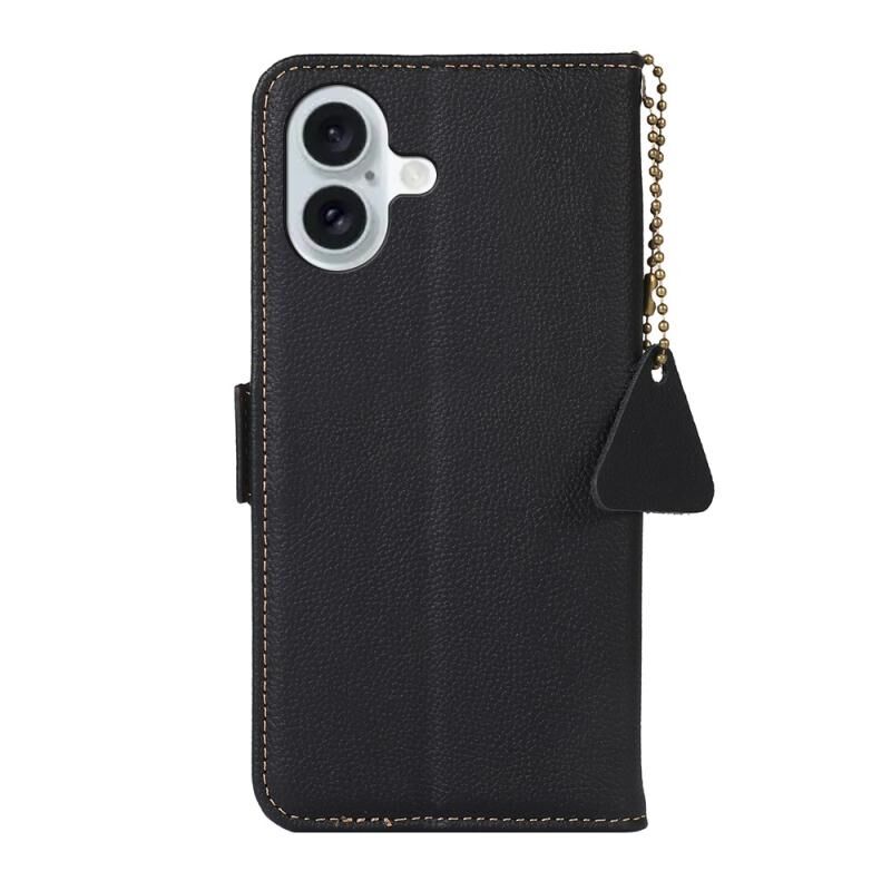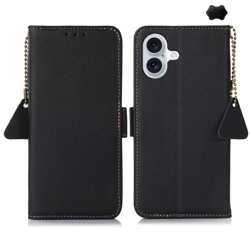 Θήκη τηλεφώνου από γνήσιο δέρμα TJ με μαγνητικό κλείσιμο στο πλάι για iPhone 16 Plus (Μαύρο)