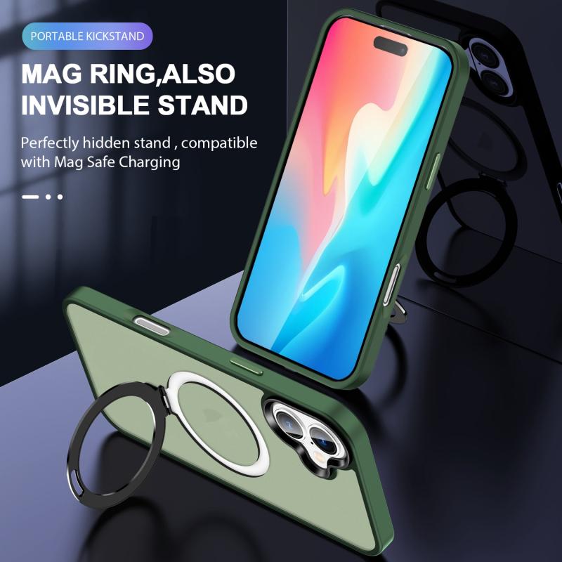 6. 360 Rotate Ring Stand: With a compact and practical design, we seamlessly combine powerful MagSafe tech with a foldable stand. The built-in kickstand effortlessly rotates 360 degrees and folds 120 degrees, giving you the ideal viewing angle for both landscape and portrait orientations. When folded, it seamlessly aligns with the back of the case, maintaining a slim profile for easy pocket-sliding.