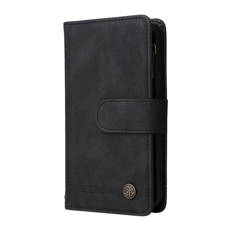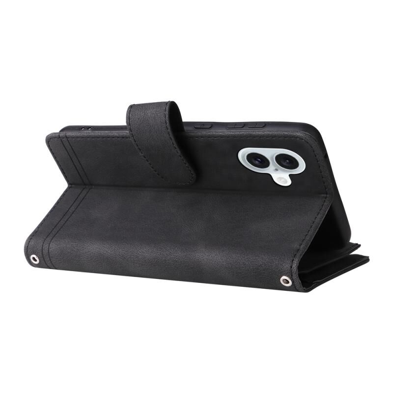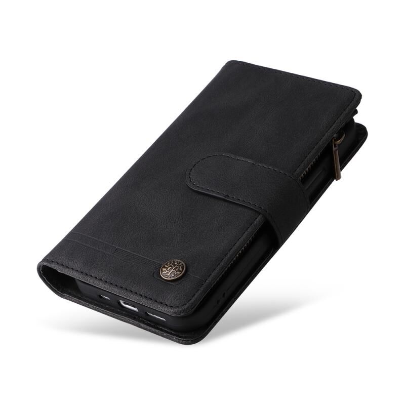 Θήκη τηλεφώνου από δέρμα με αίσθηση δέρματος, πολλαπλών καρτών και φερμουάρ για iPhone 16 Plus (Μαύρο)