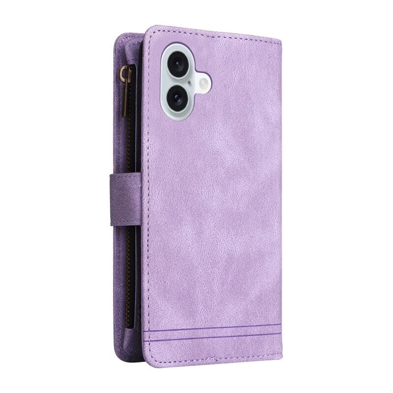 Θήκη τηλεφώνου από δέρμα με αίσθηση δέρματος, πολλαπλών καρτών και φερμουάρ για iPhone 16 Plus (Μωβ)