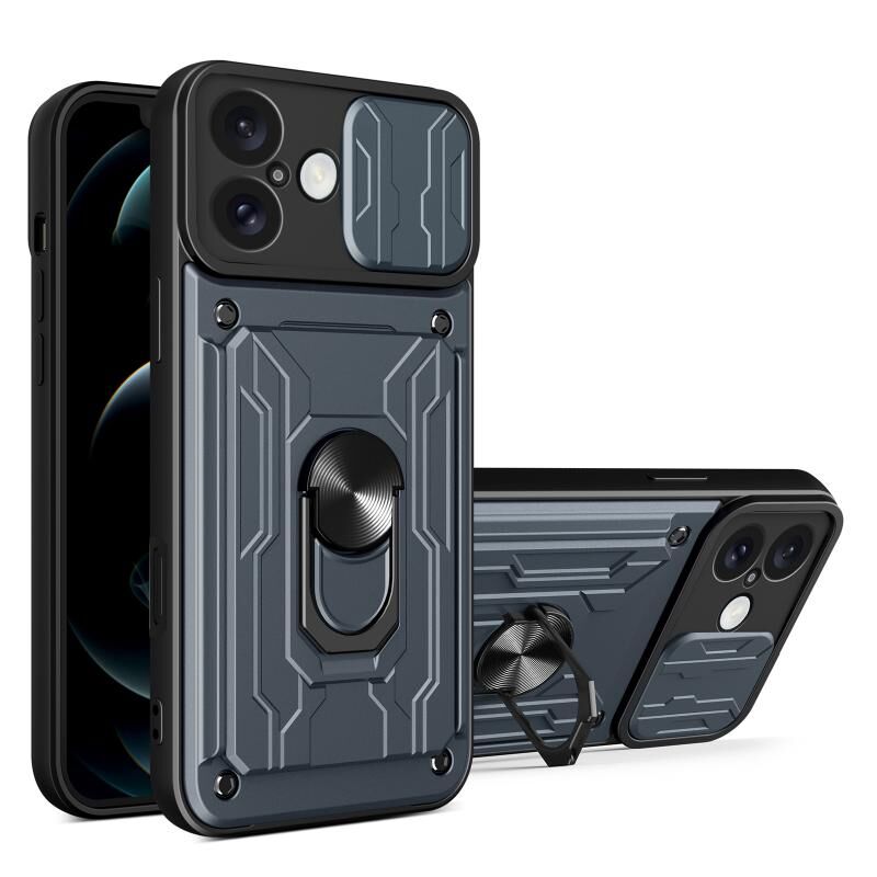 Θήκη τηλεφώνου για iPhone 16 Plus με συρόμενο προστατευτικό κάμερας, κατασκευασμένη από TPU+PC με θήκη για κάρτες (Γκρι)