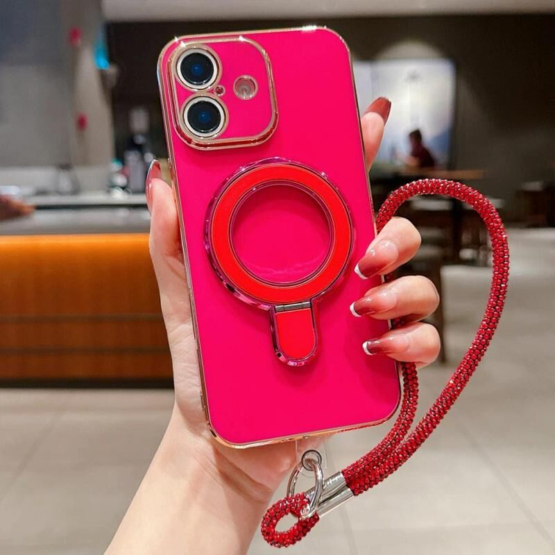 For iPhone 16 Plus Solid Color Electroplated Metal Holder Phone Case with Lanyard(Rose Red)