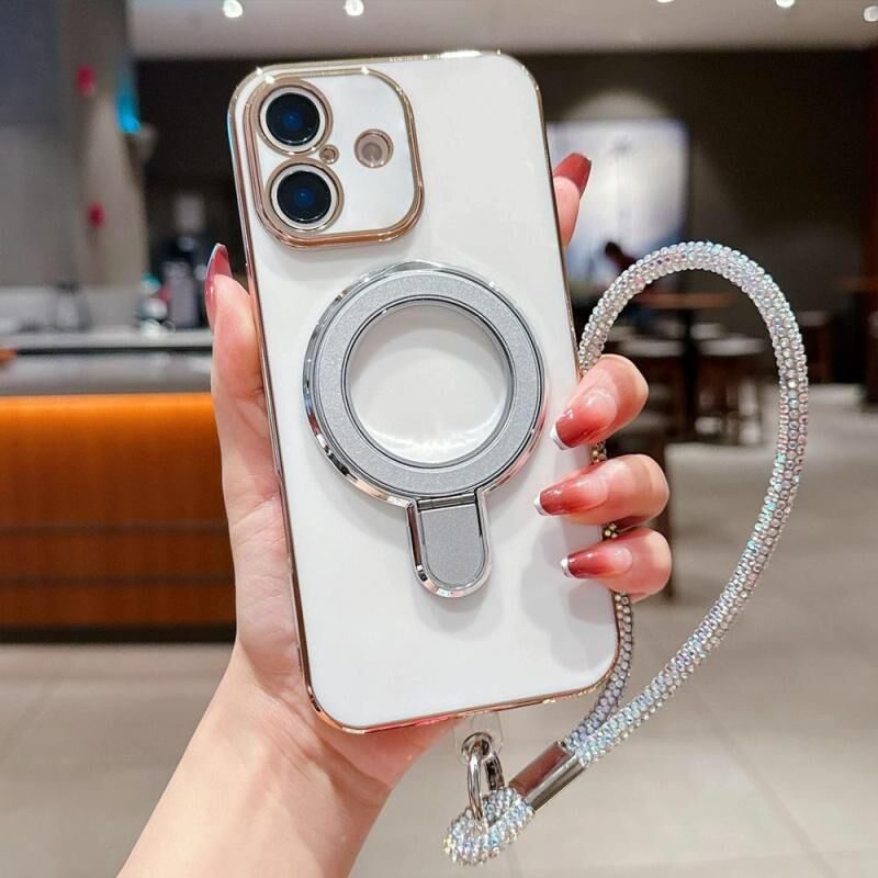 For iPhone 16 Plus Solid Color Electroplated Metal Holder Phone Case with Lanyard(Silver White)