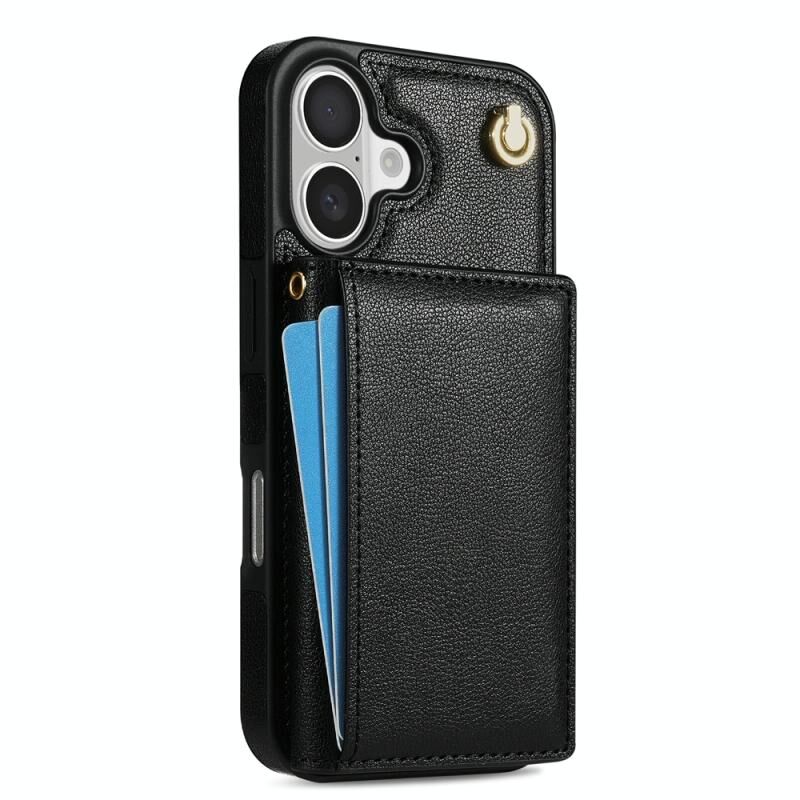 Θήκη τηλεφώνου για iPhone 16 Plus με τριπλή θήκη καρτών και μακρύ κορδόνι (Μαύρο)