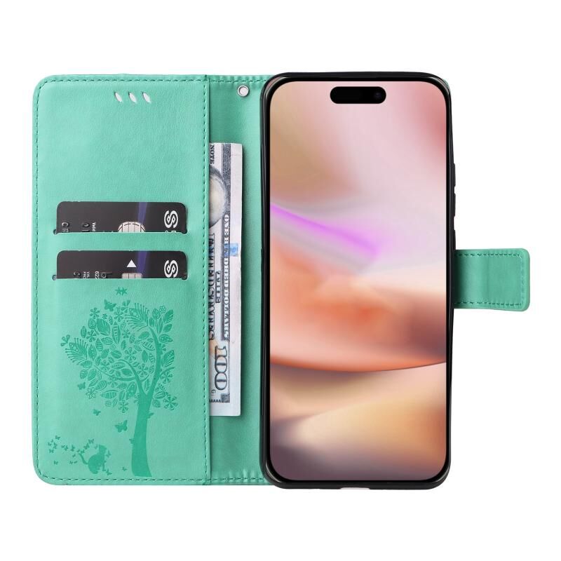 Θήκη τηλεφώνου από δέρμα με σχέδιο ανάγλυφου δέντρου & γάτας, τύπου flip, για iPhone 16 Plus (Πράσινο)
