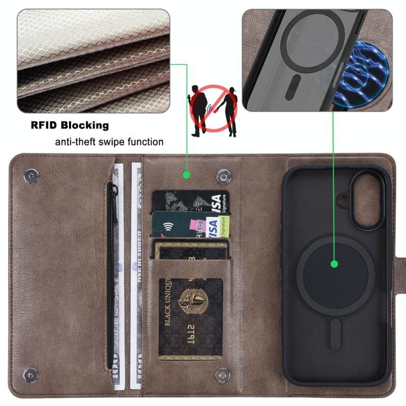 2. Λειτουργία πορτοφολιού: Η δερμάτινη θήκη είναι εξοπλισμένη με πορτοφόλι με φερμουάρ, υποδοχές για κάρτες και διαμερίσματα για μετρητά για κάρτες και ένα μικρό χρηματικό ποσό.