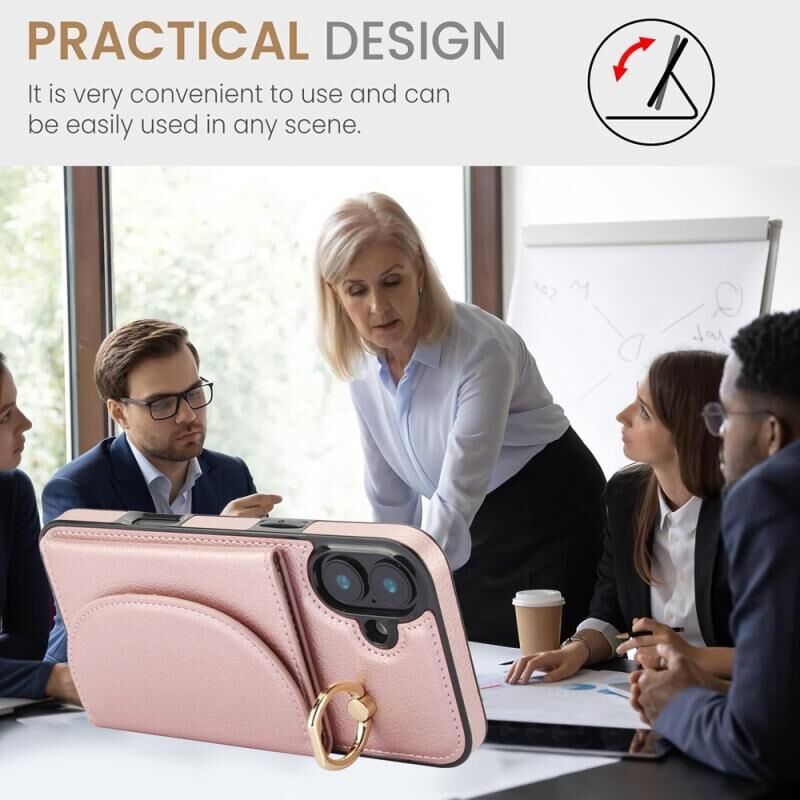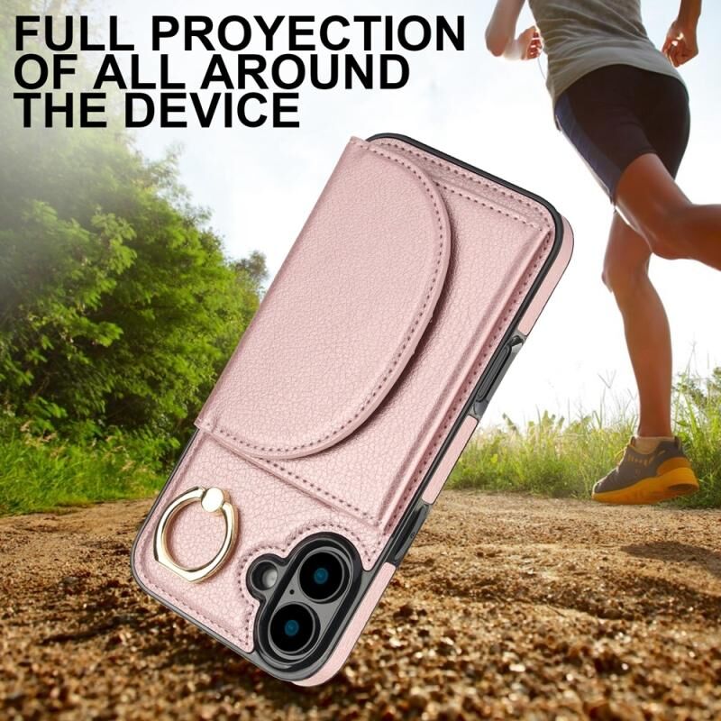 Θήκη κινητού τηλεφώνου για iPhone 16 Plus YM007 με δακτύλιο στήριξης και θήκη κάρτας, αίσθηση δέρματος (Ροζ χρυσός)