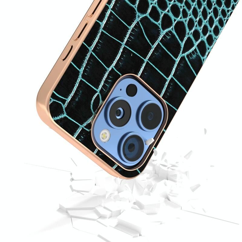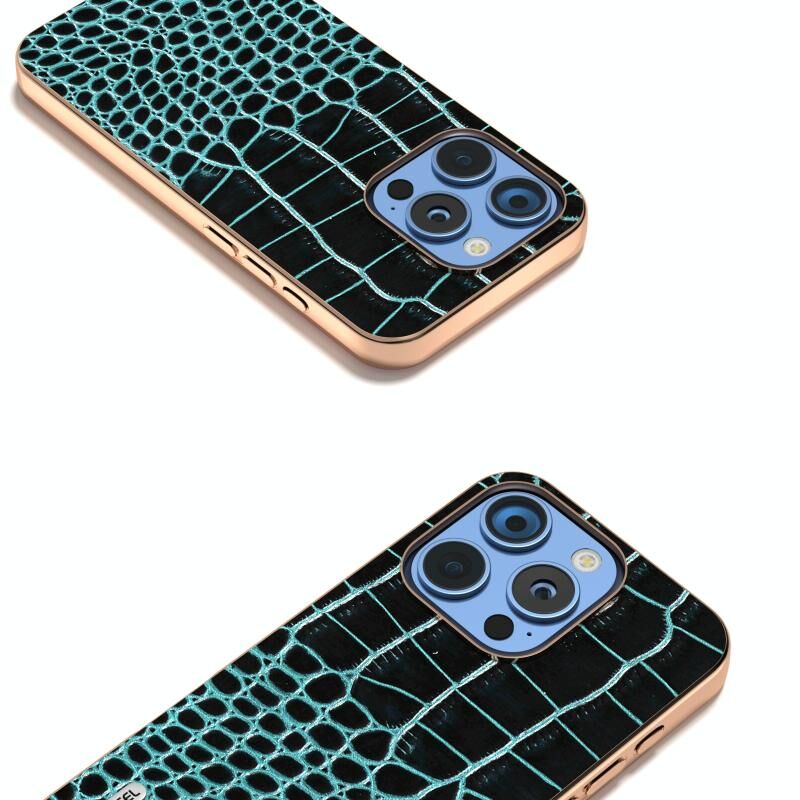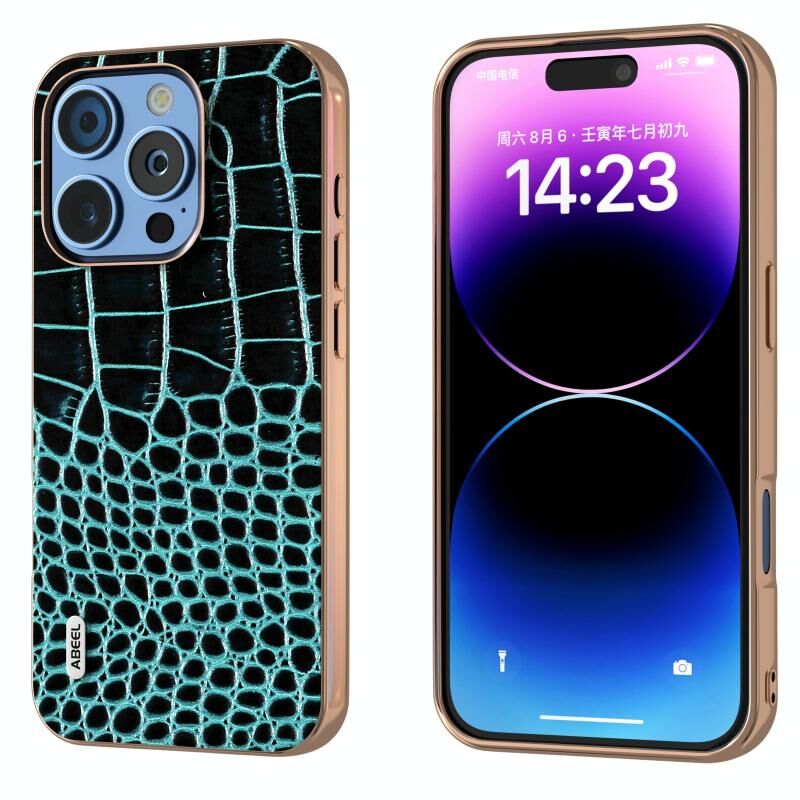 Θήκη τηλεφώνου για iPhone 16 Pro ABEEL με ηλεκτρολυτικό πλαίσιο και γνήσιο δέρμα με μοτίβο κροκόδειλου (Μπλε)