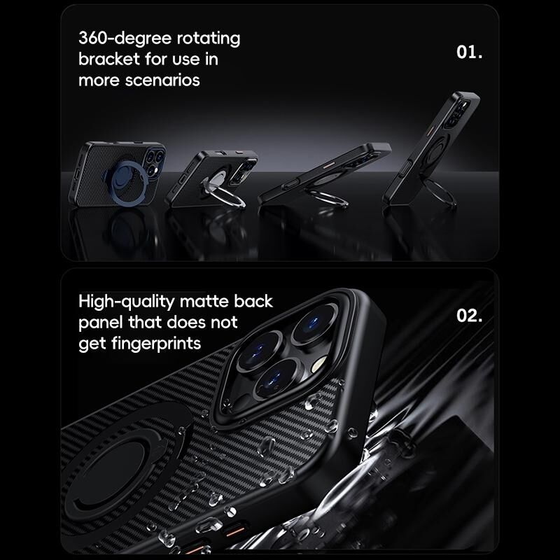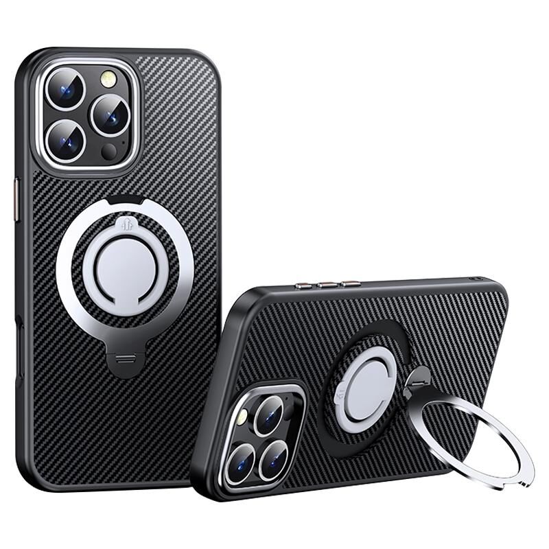 Θήκη τηλεφώνου MagSafe από ανθρακονήματα για iPhone 16 Pro με περιστρεφόμενη βάση 360 μοιρών (Μαύρο Γκρι)