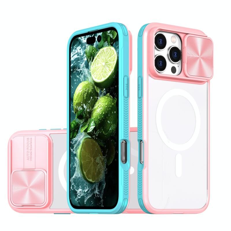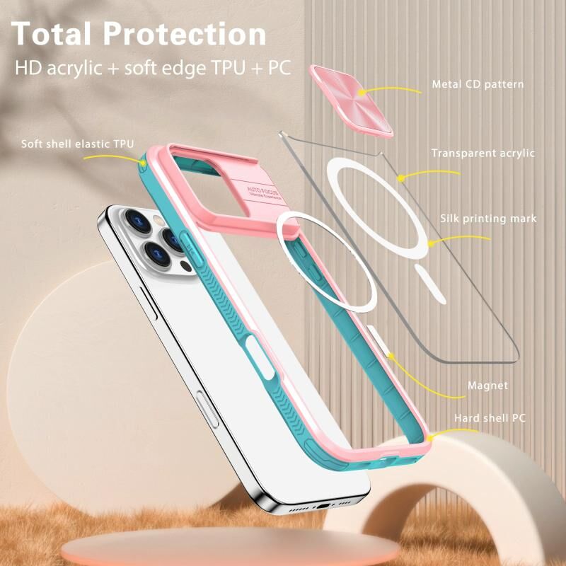 Θήκη κινητού τηλεφώνου πλήρους κάλυψης για iPhone 16 Pro με διαφανές ακρυλικό + PC + TPU, με ολισθητικό κάλυμμα φακού MagSafe (Ροζ+Κυανό)