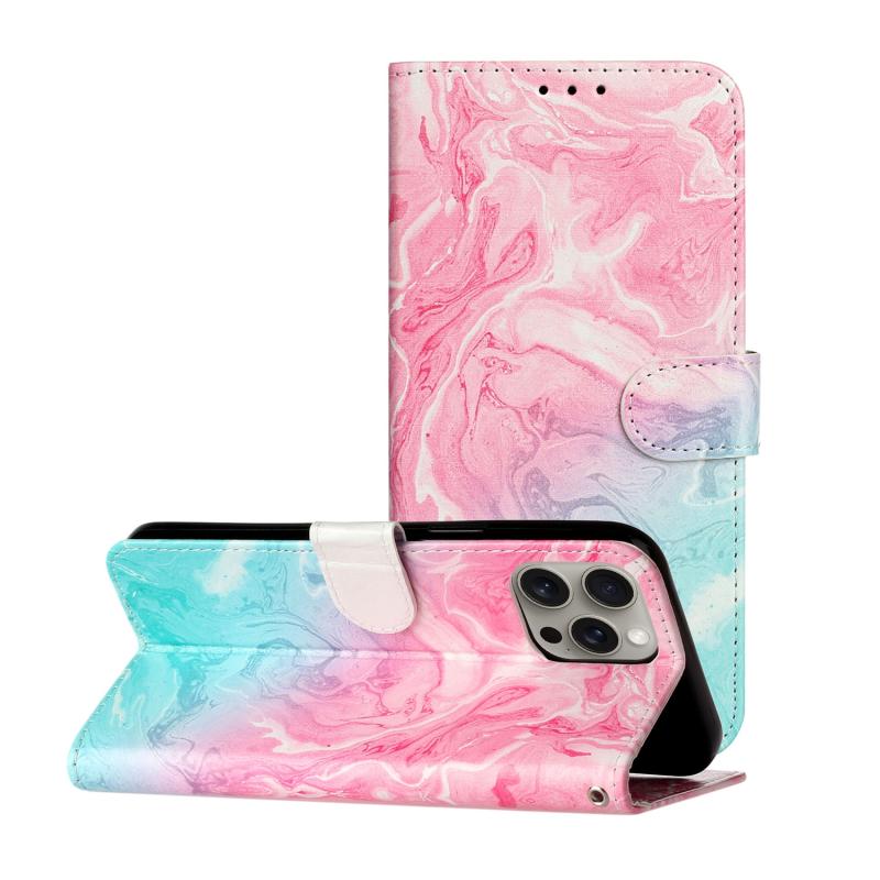 For iPhone 16 Pro Colored Drawing Marble Pattern Leather Phone Case(Pink Green Marble)