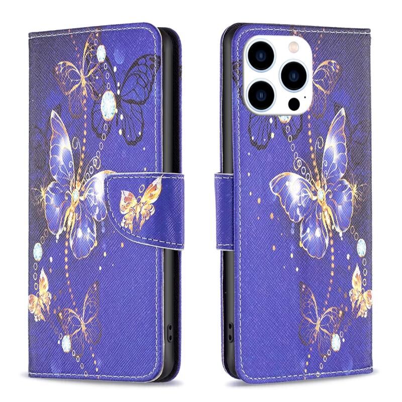 Θήκη τηλεφώνου από δέρμα με σχέδιο πολύχρωμης ζωγραφικής και πτυσσόμενο μηχανισμό για iPhone 16 Pro (Μωβ Πεταλούδα)