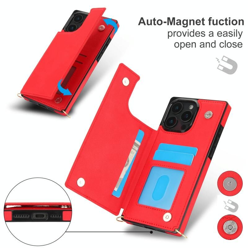 Θήκη τηλεφώνου τύπου πορτοφολιού με κάρτες, διαγώνια, τετράγωνη, με διπλή αγκράφα για iPhone 16 Pro (Κόκκινη)