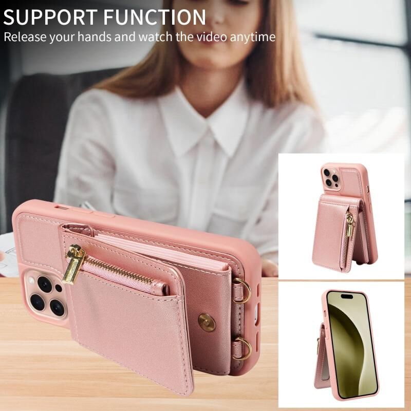 For iPhone 16 Pro Crossbody Lanyard Zipper Wallet Leather Phone Case(Rose Gold)