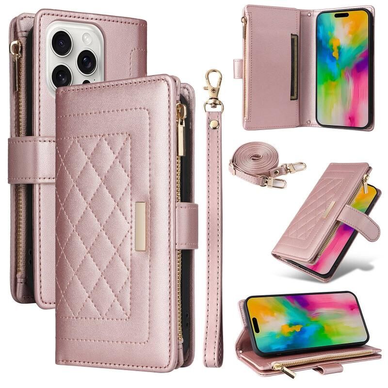 Θήκη τηλεφώνου από δέρμα σε σχήμα ρόμβου με φερμουάρ και λουρί για iPhone 16 Pro (Χρυσό ροζ)