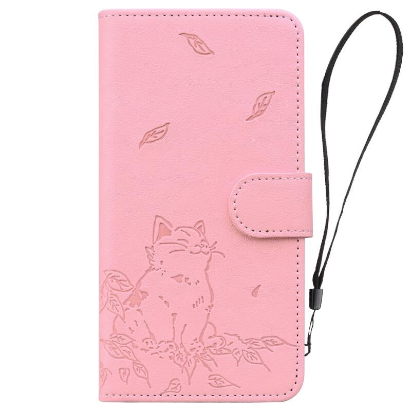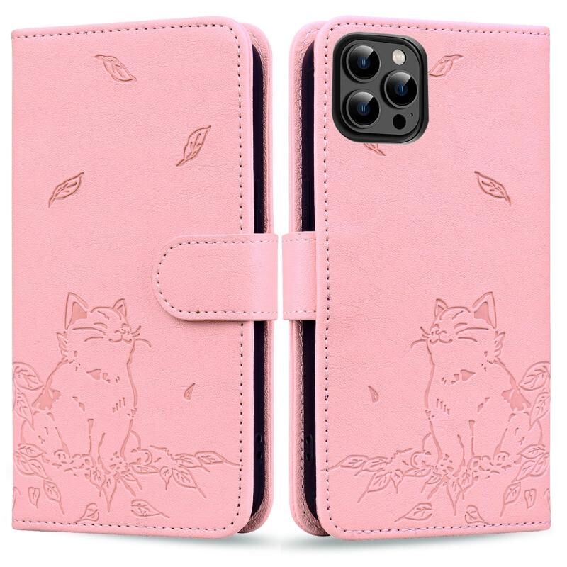 Για iPhone 16 Pro Θήκη Δερμάτινη με Χαριτωμένο Γάτο σε Ρελιέφ (Ροζ)