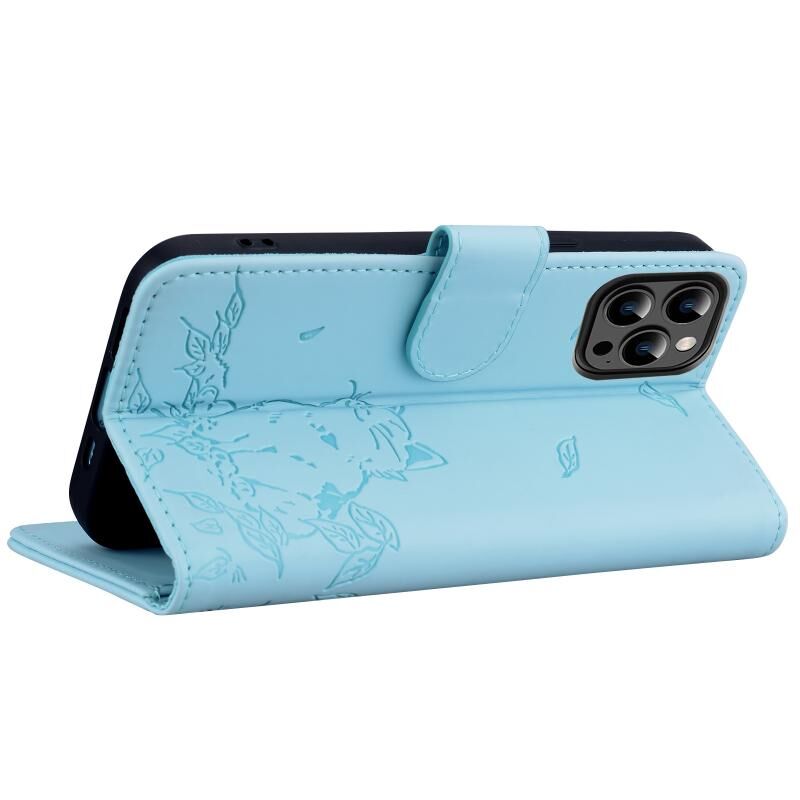 Θήκη τηλεφώνου από δέρμα με ανάγλυφο γατάκι για iPhone 16 Pro (Γαλάζιο του ουρανού)
