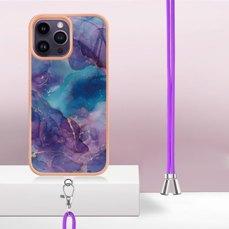 For iPhone 16 Pro Electroplating Marble Dual-side IMD Phone Case with Lanyard(Purple 016)
