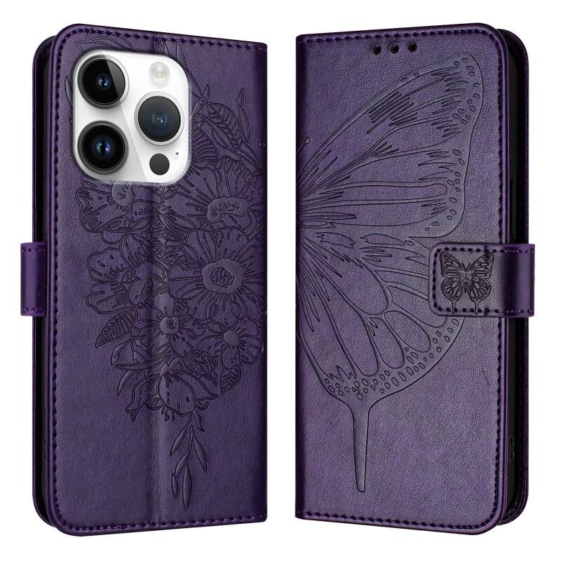 For iPhone 16 Pro Embossed Butterfly Leather Phone Case(Dark Purple)