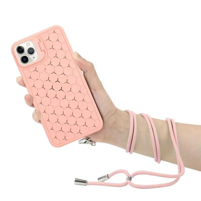 For iPhone 16 Pro Honeycomb Radiating Lens Holder Magsafe Phone Case with Lanyard(Pink)