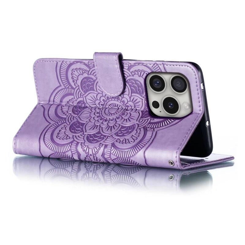 Θήκη τηλεφώνου από δέρμα με οριζόντιο άνοιγμα και ανάγλυφο σχέδιο Mandala για iPhone 16 Pro (Μπλε)