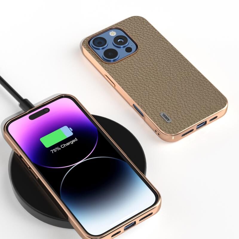 Θήκη τηλεφώνου για iPhone 16 Pro Max ABEEL με ηλεκτρολυτικό πλαίσιο και γνήσιο δέρμα με υφή λυτσί (Μαύρο)