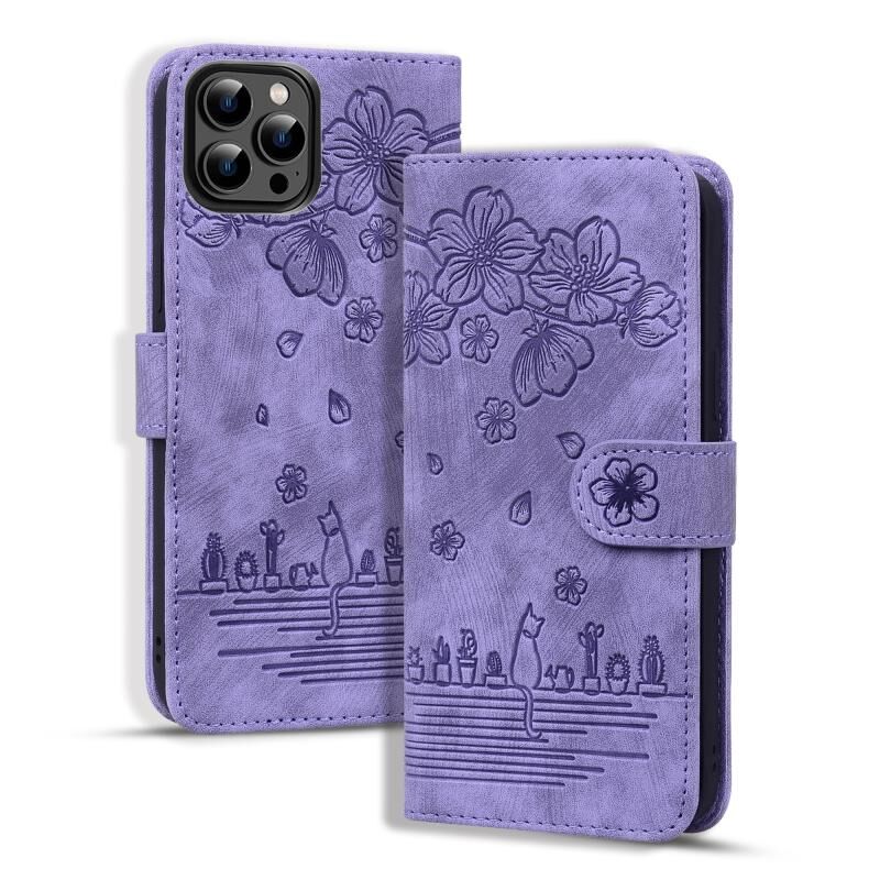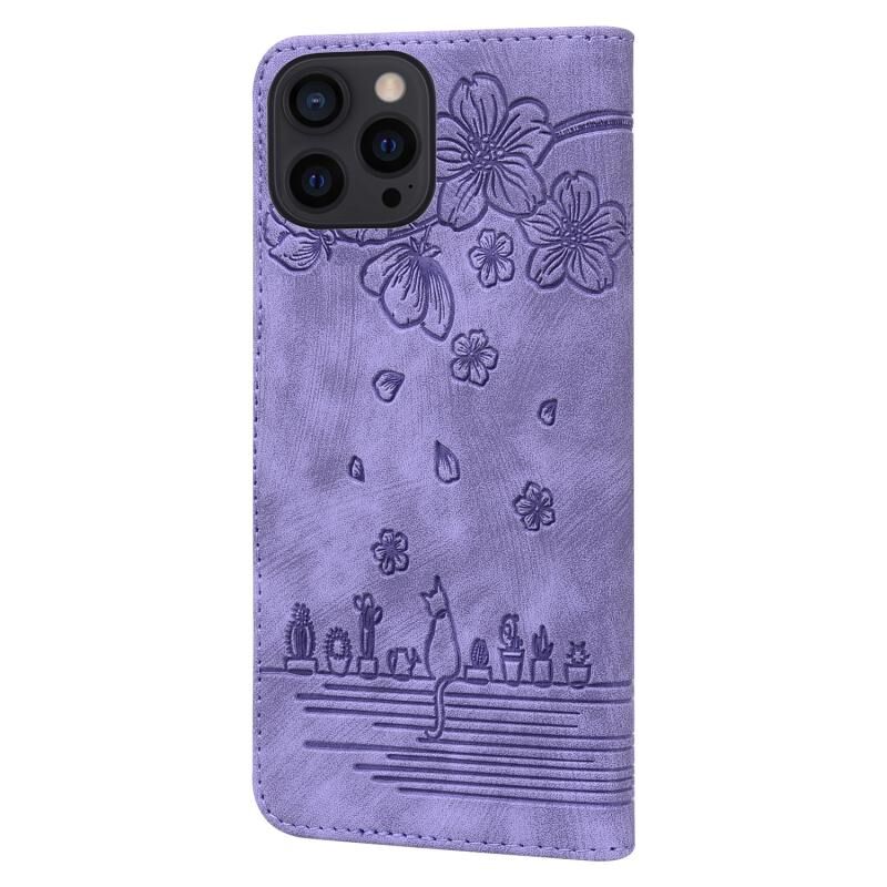 For iPhone 16 Pro Max Cartoon Sakura Cat Embossed Leather Phone Case(Purple)