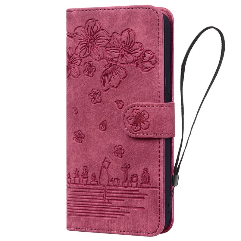 For iPhone 16 Pro Max Cartoon Sakura Cat Embossed Leather Phone Case(Wine Red)