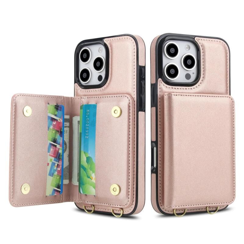 For iPhone 16 Pro Max Crossbody Dual-buckle Wallet RFID Back Leather Phone Case(Rose Gold)