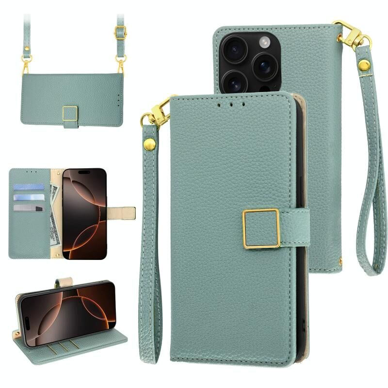 Θήκη τηλεφώνου από δέρμα με υφή λύτσι, τετράγωνη αγκράφα για iPhone 16 Pro Max (Μπλε)
