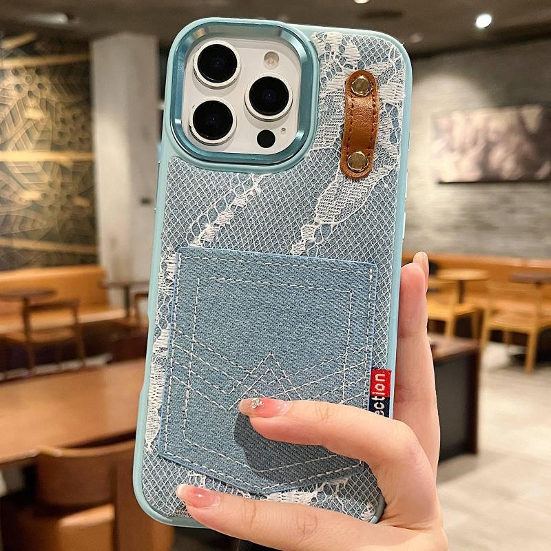 For iPhone 16 Pro Max Denim Leather Pocket Design Phone Case(Light Blue)