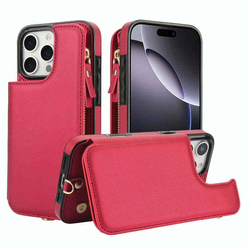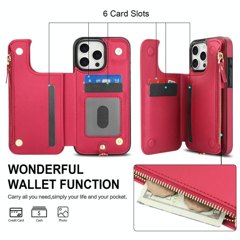 For iPhone 16 Pro Max Double Flap Zipper RFID Leather Phone Case with Short Lanyard(Red)