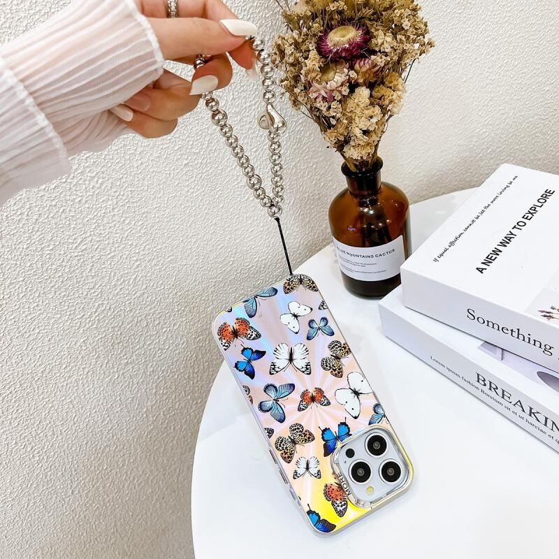 Θήκη τηλεφώνου με ηλεκτρολυτική επίστρωση και σχέδιο πεταλούδας laser για iPhone 16 Pro Max με λουρί καρπού (Μπλε Πεταλούδες AB4)