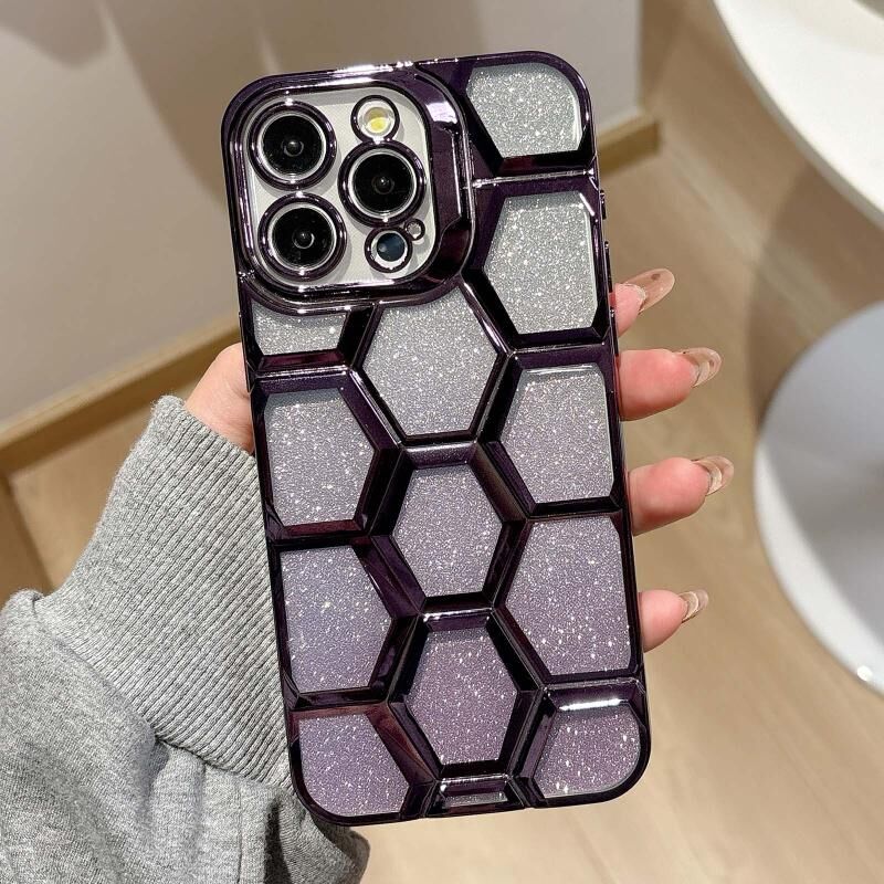 Θήκη τηλεφώνου TPU με ηλεκτρολυτική επίστρωση, χάραξη laser και 3D κυψελοειδές σχέδιο με γκλίτερ για iPhone 16 Pro Max (Μωβ)