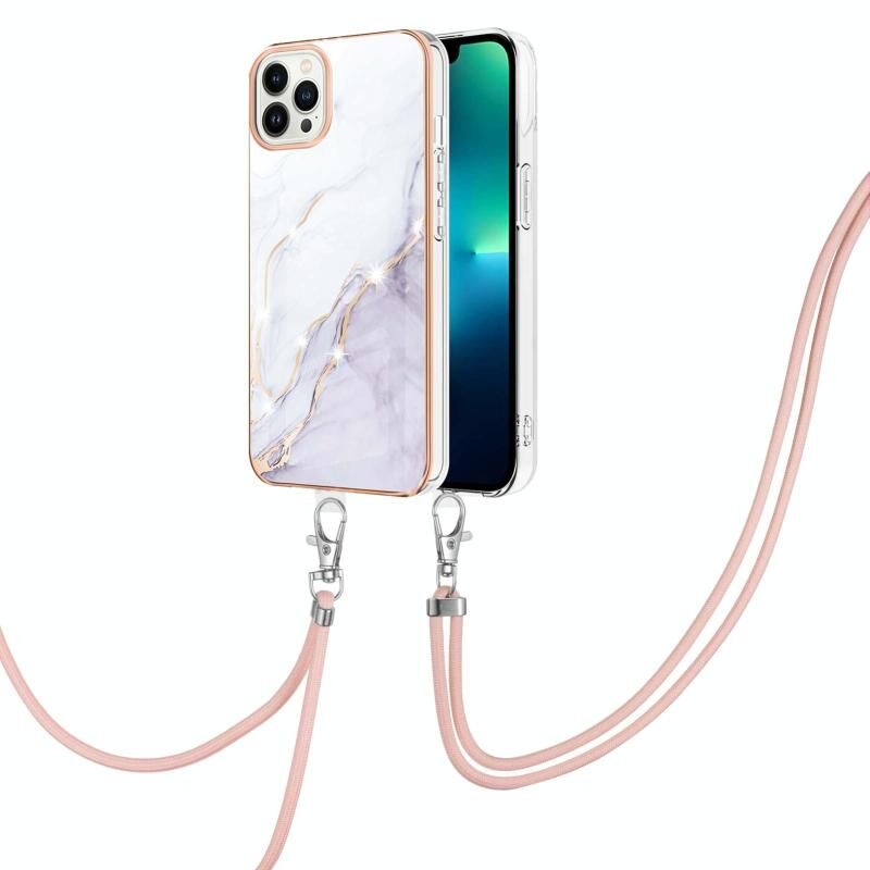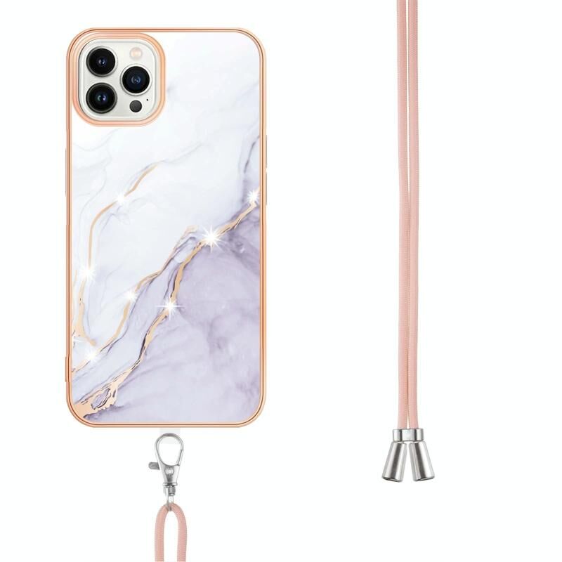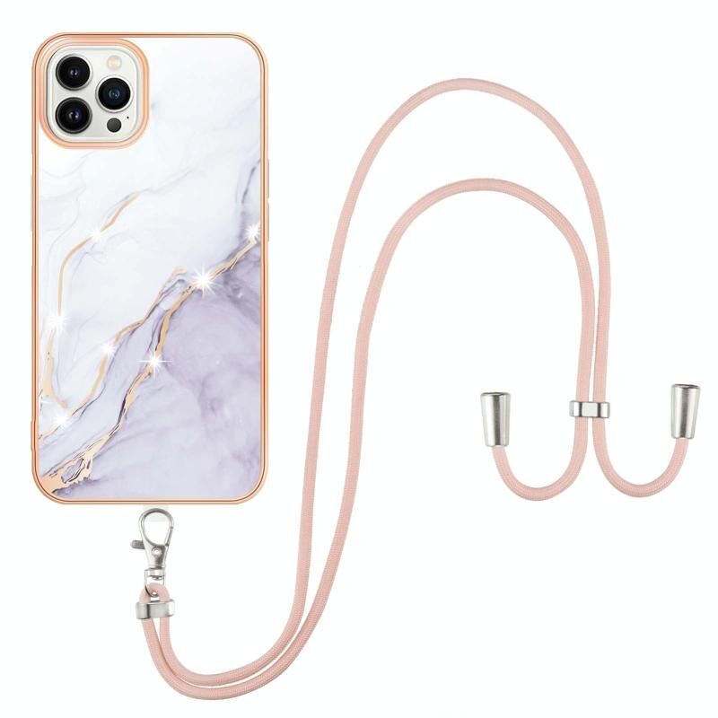 Θήκη τηλεφώνου με επιμετάλλωση, μαρμάρινη, διπλής όψης IMD για iPhone 16 Pro Max με κορδόνι (Μωβ 001)