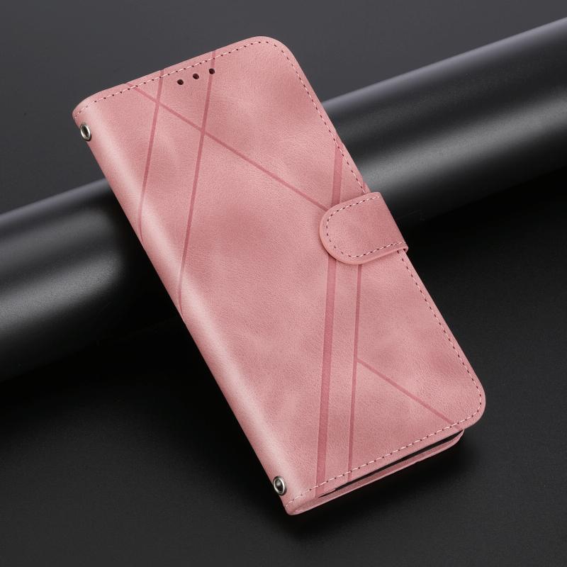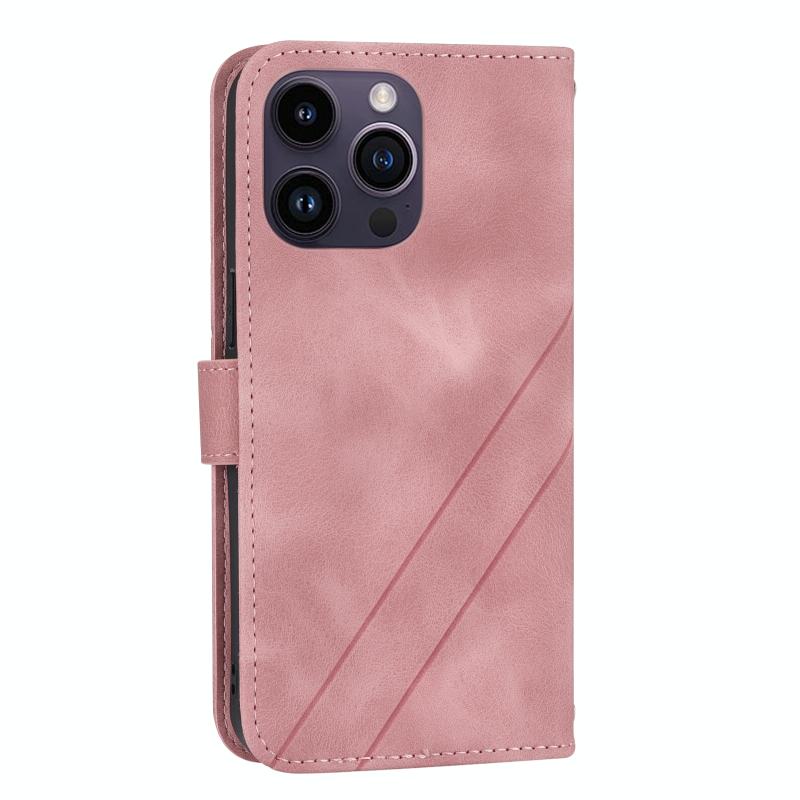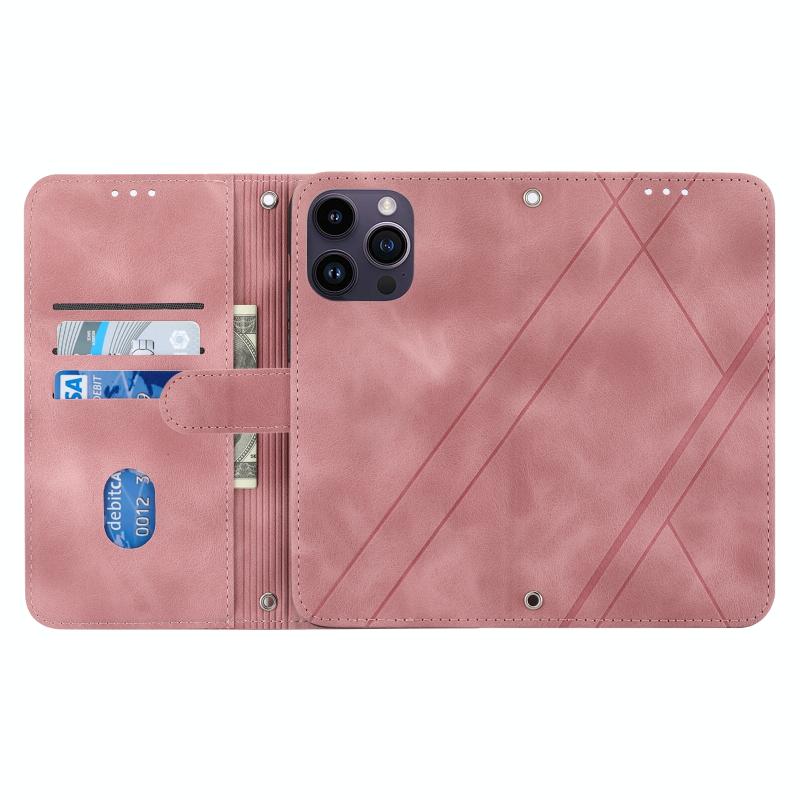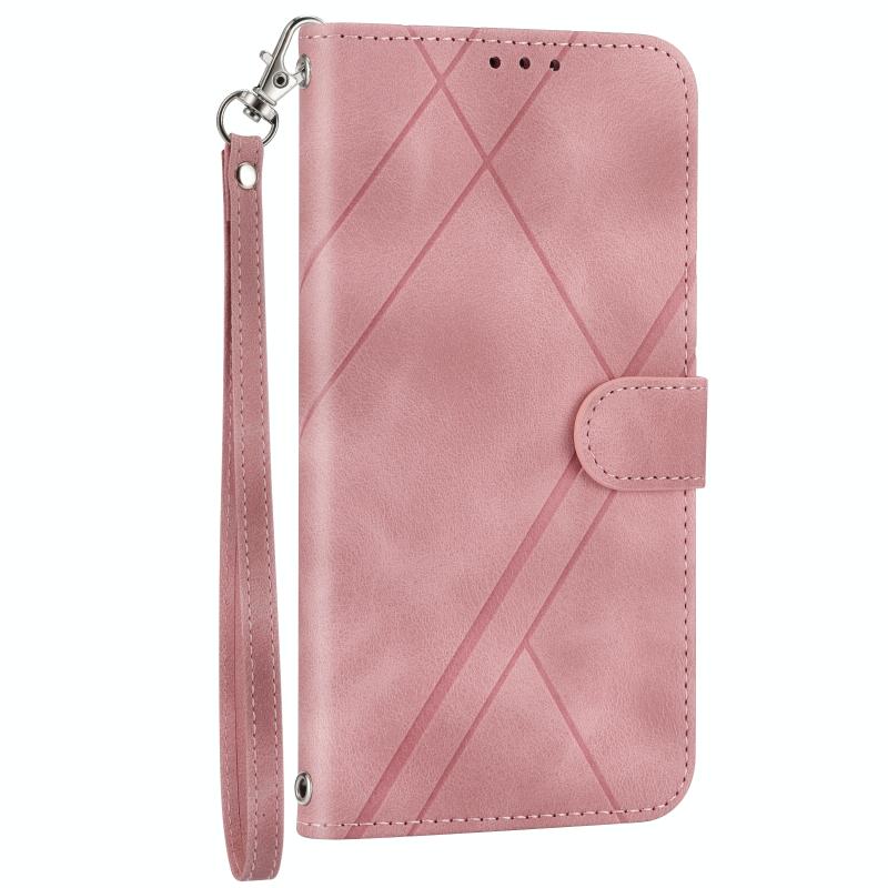 For iPhone 16 Pro Max Embossed Line Leather Phone Case with Lanyard(Pink)