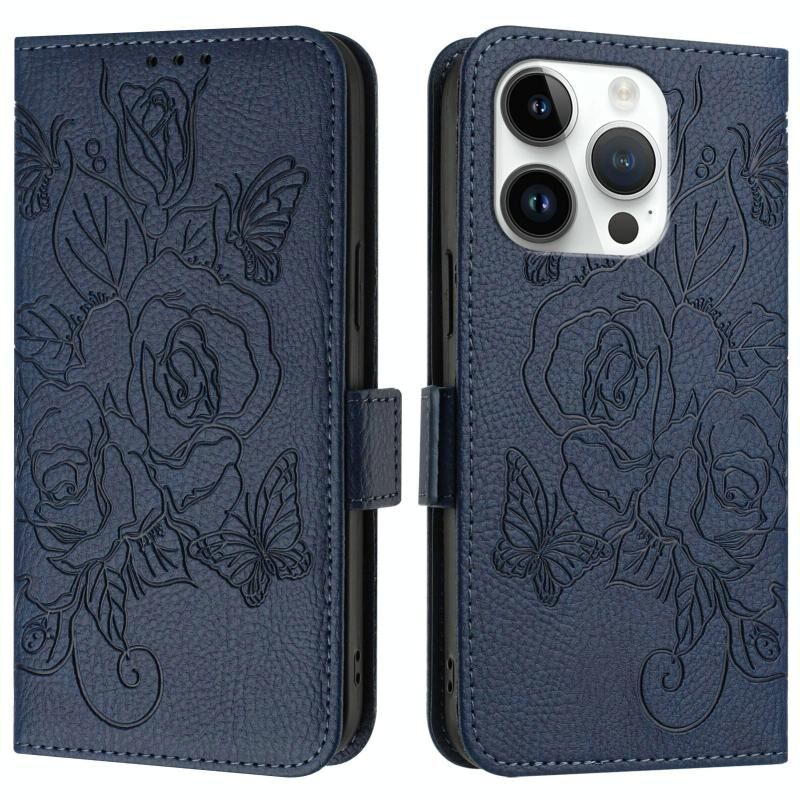 Θήκη τηλεφώνου δερμάτινη με ανάγλυφο σχέδιο τριαντάφυλλου και προστασία RFID κατά της κλοπής για iPhone 16 Pro Max (Σκούρο μπλε)