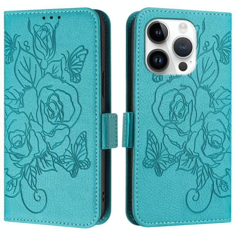 Θήκη τηλεφώνου δερμάτινη με ανάγλυφο σχέδιο τριαντάφυλλου και προστασία RFID κατά της κλοπής για iPhone 16 Pro Max (Ανοιχτό μπλε)