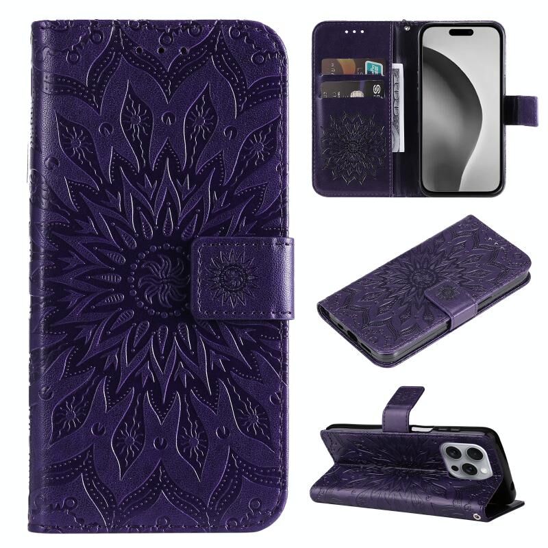 Θήκη τηλεφώνου από δέρμα με σχέδιο ηλιοτρόπιου σε ανάγλυφο για iPhone 16 Pro Max (Μωβ)