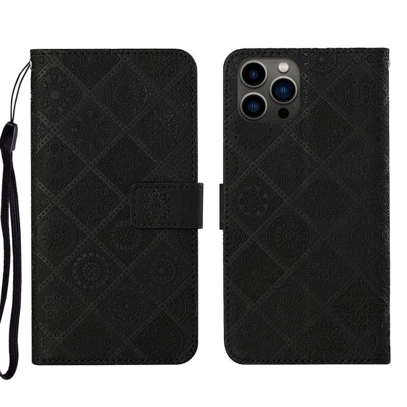 Για iPhone 16 Pro Max Ethnic Style ανάγλυφο μοτίβο δερμάτινη θήκη τηλεφώνου (Μαύρο)