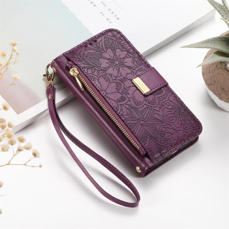 For iPhone 16 Pro Max Flowers Leaves Zipper Wallet Leather Phone Case with Strap(Purple)